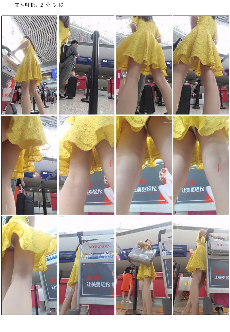 北京大興機場露臉超清抄底黃色連衣裙美婦 透明蕾絲騷丁 俏皮的毛毛跑出來透透氣
